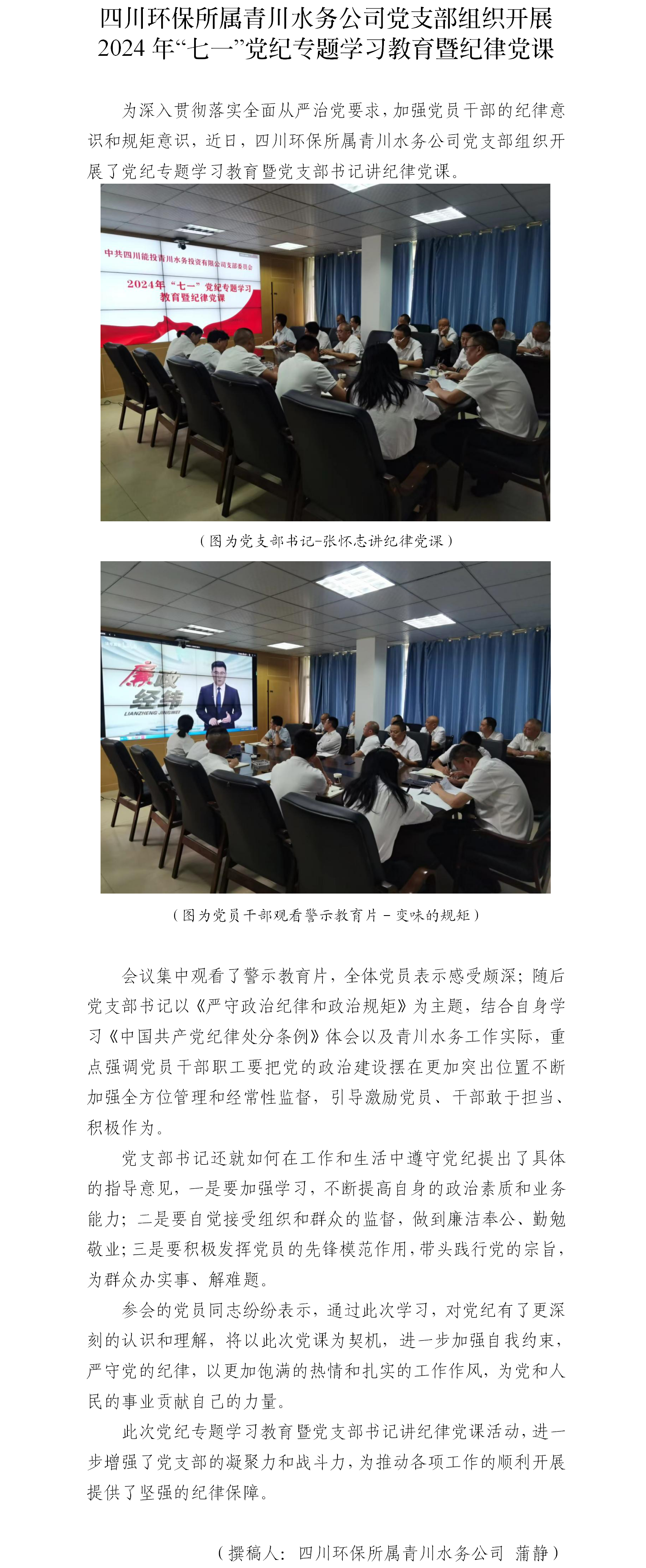 四川環保所屬青川水務公司黨支部組織開展 2024年“七一”黨紀專題學習教育暨紀律黨課