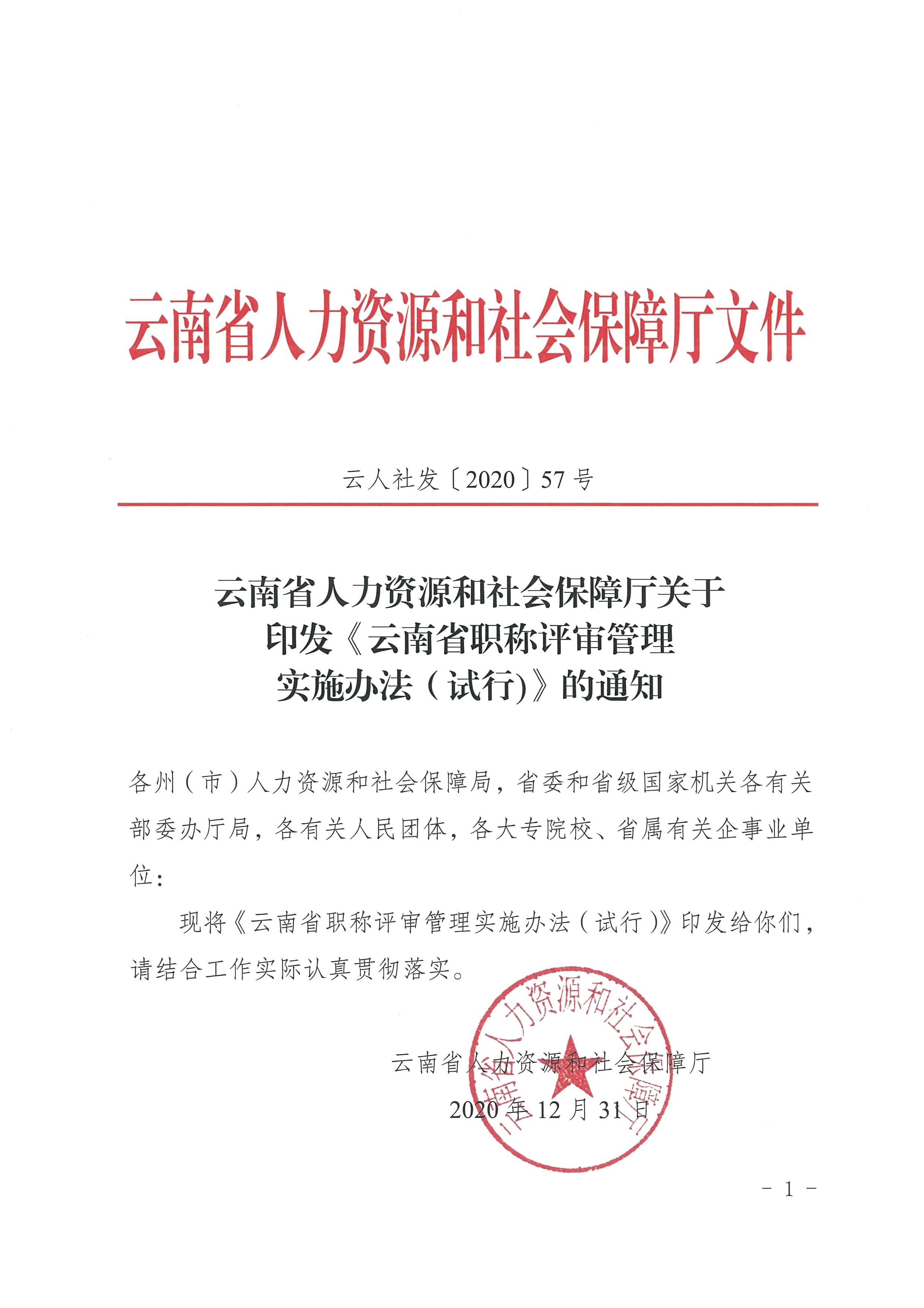 云南省人力資源和社會(huì)保障廳關(guān)于印發(fā)《云南省職稱評(píng)審管理實(shí)施辦法(試行)》的通知