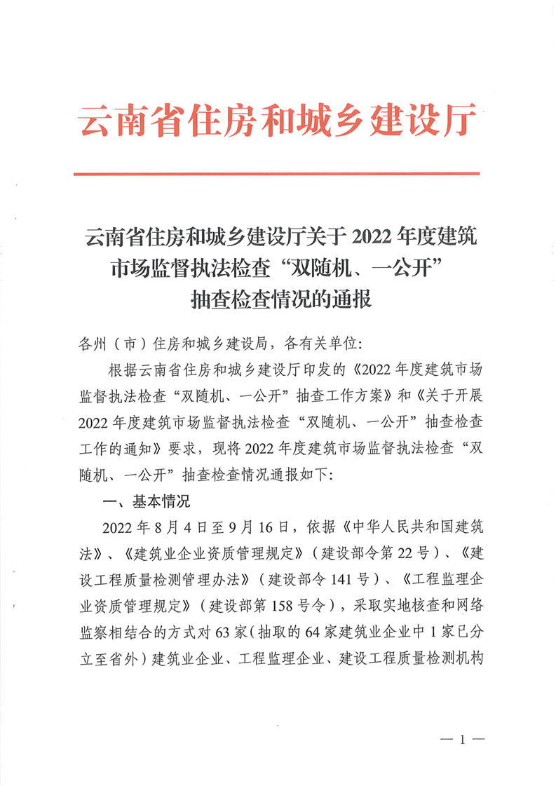 云南省住房和城鄉(xiāng)建設廳關于2022年度建筑市場監(jiān)督執(zhí)法檢查“雙隨機、一公開”抽查檢查情況的通報